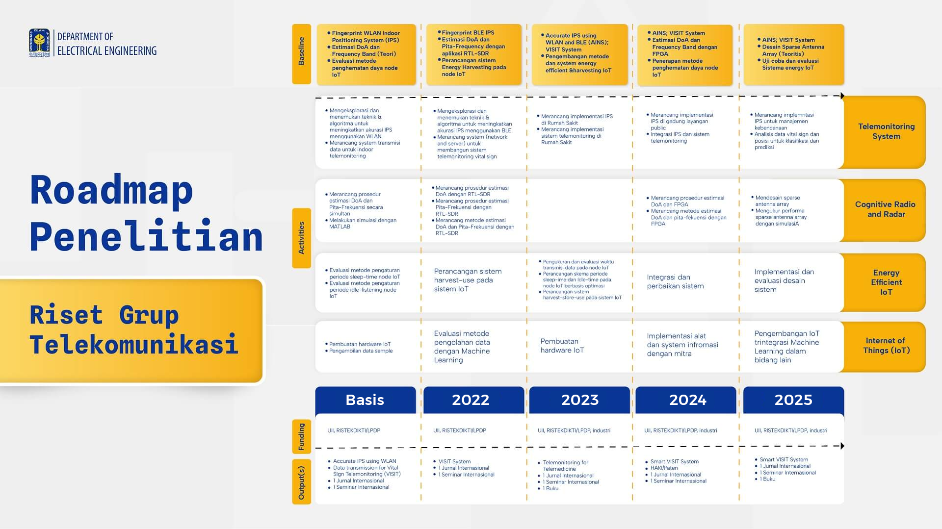Telecommunication technology is one of the rapidly evolving technologies. The Telecommunications Laboratory supports cutting-edge research that equips students with insights into trends in telecommunications technology in the industrial world. Some research topics include indoor localization, Mobile Ad Hoc Network (MANET), Vehicular Ad Hoc Network (VANET), cognitive radio, and telecommunication technology for disaster mitigation. Additionally, some activities conducted by the laboratory research group include basic Fiber Optic workshops, Internet of Things (IoT) Project Competitions, MATLAB for Telecommunications, Network Simulator (NS) for Beginners, and industrial visits to various places (such as the Radar Maintenance Depot in Solo). The Telecommunications Laboratory research group is a place for students to develop their knowledge in telecommunications further.